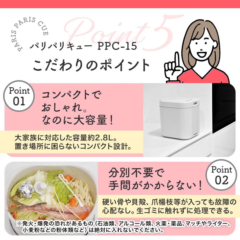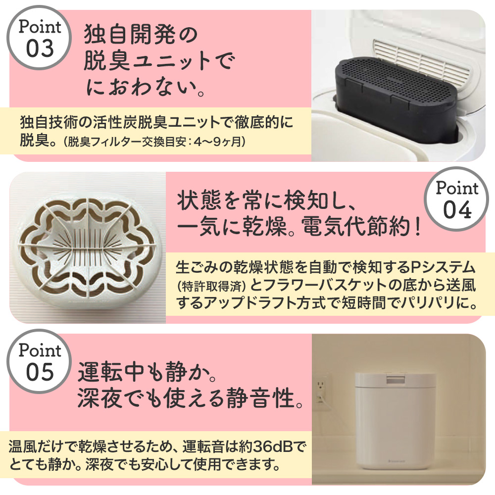 ・生ごみを乾燥させると嫌なにおいや腐敗の悪臭、虫・コバエの発生を防ぐことができます。