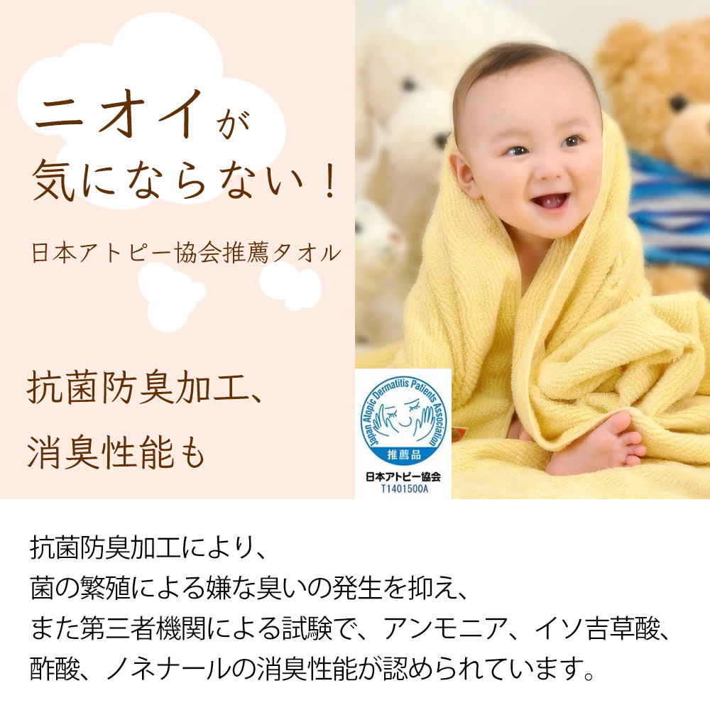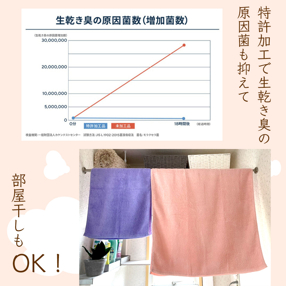 抗菌防臭・消臭効果は100回洗濯しても効果が持続。洗濯する度にふっくら柔らかさがアップする加工も施されていて、吸水性は第三者機関による試験をクリア!高い吸水性も証明されています。