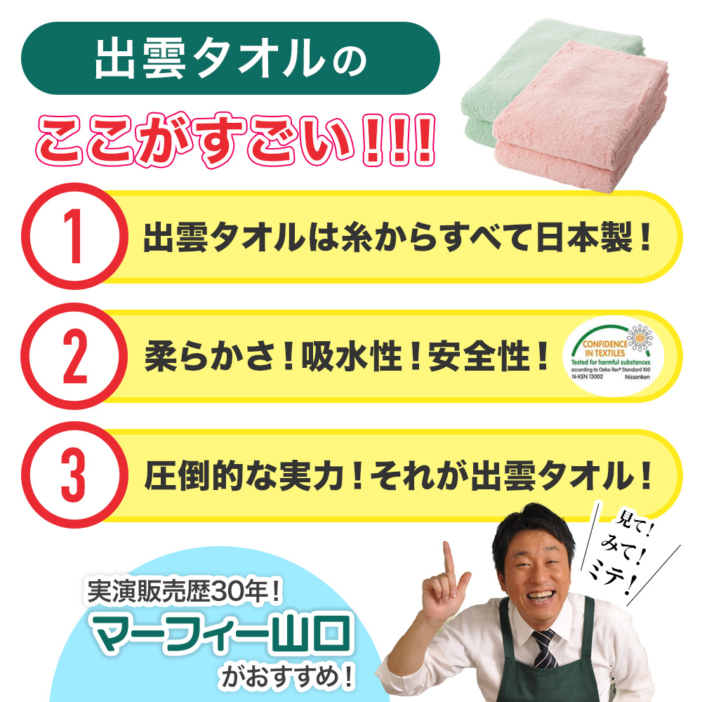 エコテックススタンダード100クラス「製品分類」をクリアしている、出雲タオル「優つつみ」。