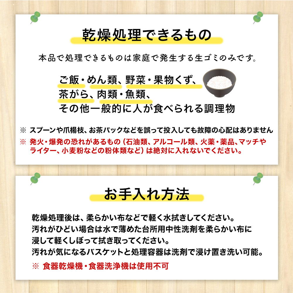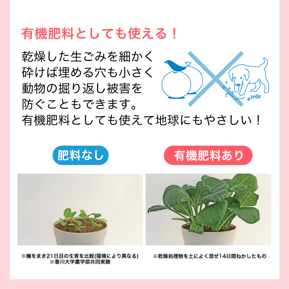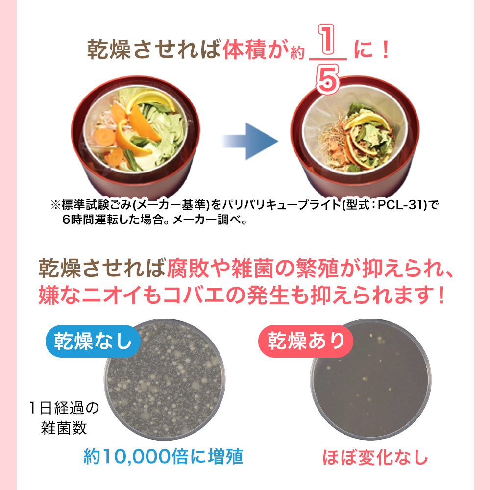 ・生ごみを乾燥させると嫌なにおいや腐敗の悪臭、虫・コバエの発生を防ぐことができます。