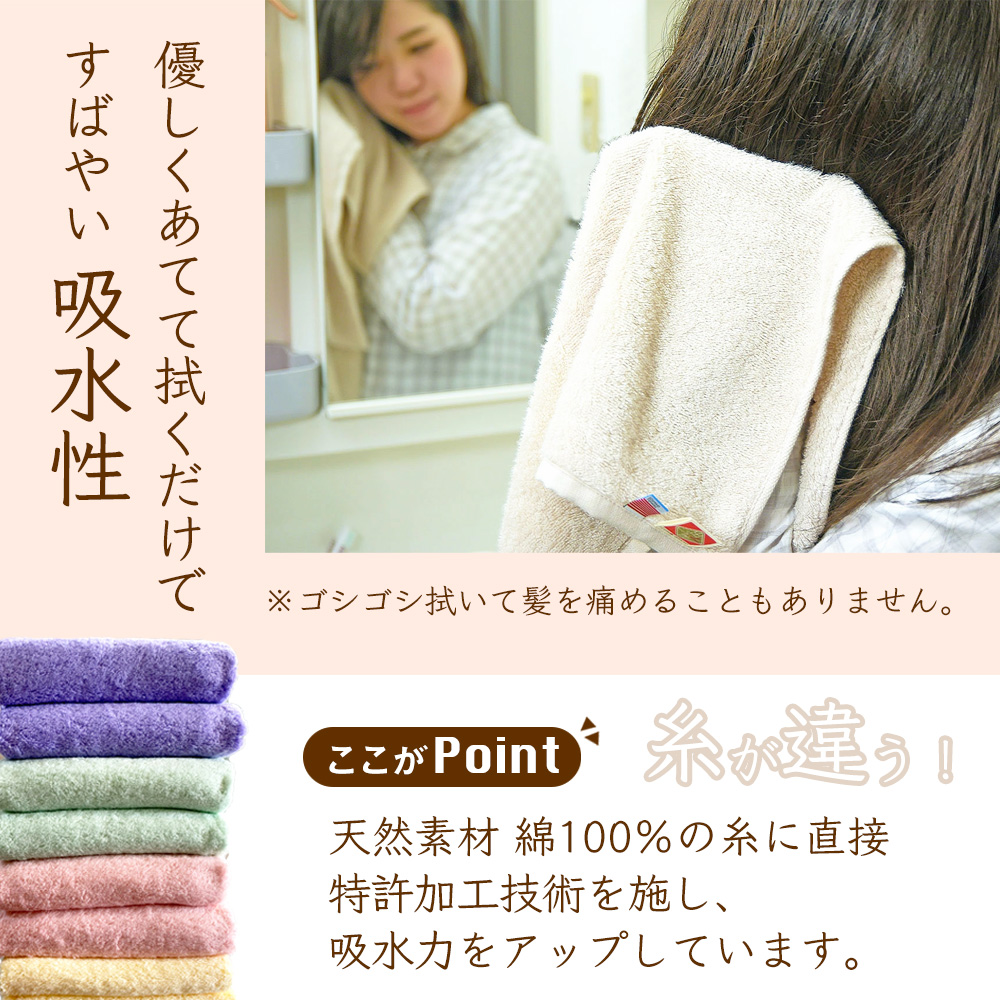 塩素や苛性ソーダなど、環境に悪いものは一切使用せず、メーカー独自の特許加工技術、酵素の力で精錬・加工を施します。環境に良いだけでなく、使う人にも優しいタオルに仕上げています。