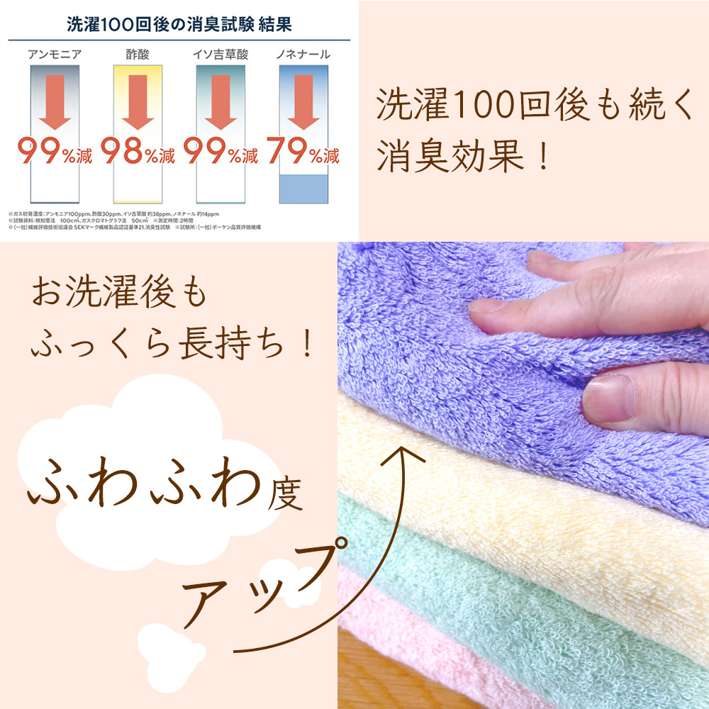 抗菌防臭・消臭効果は100回洗濯しても効果が持続。洗濯する度にふっくら柔らかさがアップする加工も施されていて、吸水性は第三者機関による試験をクリア!高い吸水性も証明されています。