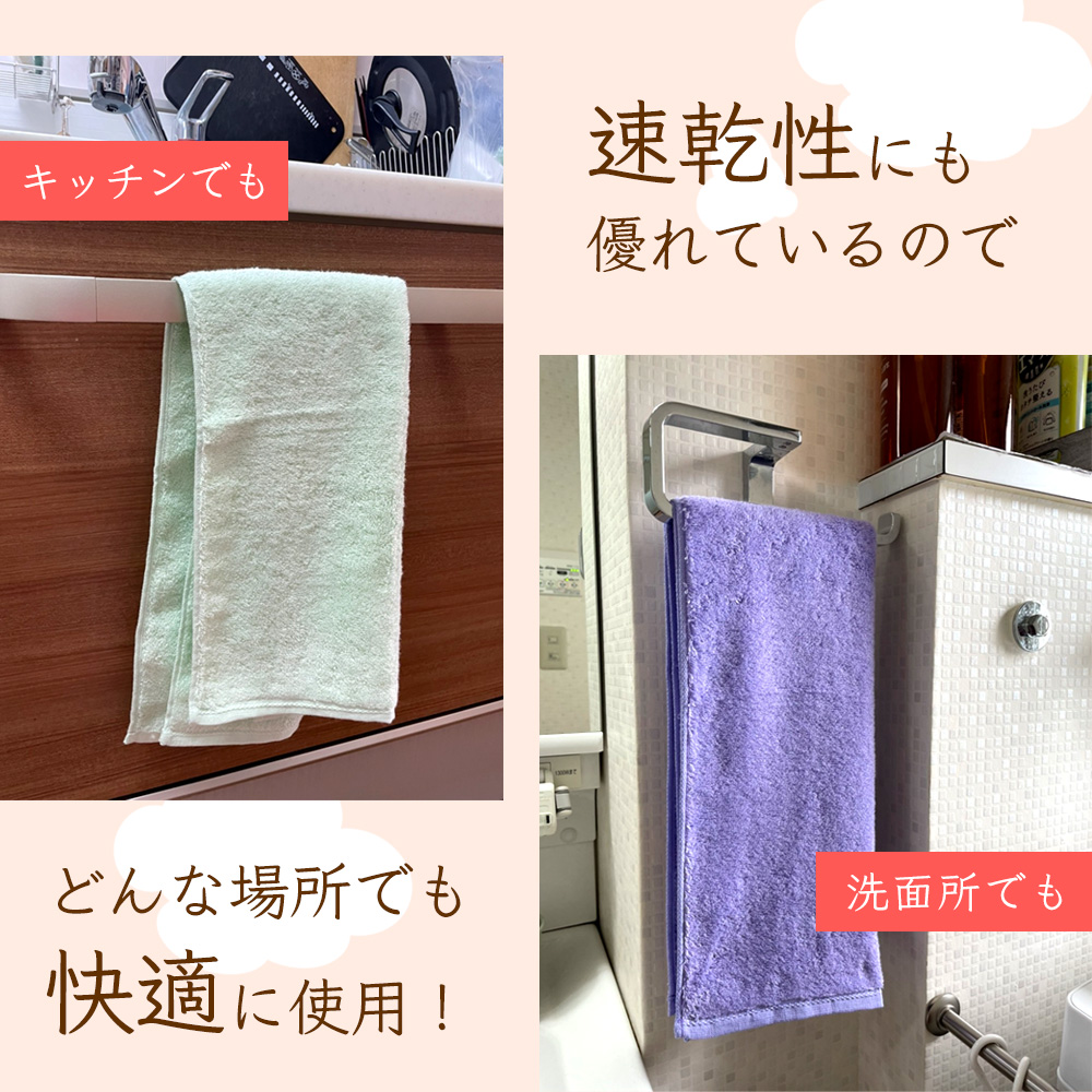 ・長時間の直射日光での乾燥は繊維を固くする要因となり、また紫外線がタオルの色を褪色させる原因となりますので風通しの良い陰干しをおすすめします
